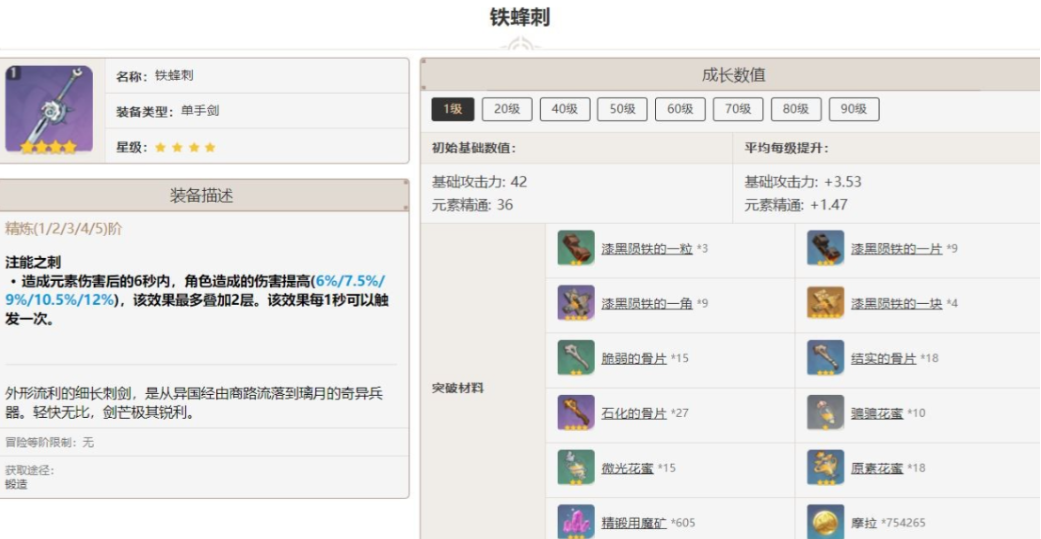 铁蜂刺的被动效果是在造成元素伤害后提升角色造成的伤害,持续6秒可叠加两层。由于副词条为元素精通,该武器适合依赖元素反应的角色使用。枫原万叶、久岐忍、艾尔海森以及草元素旅行者等角色能有效利用其属性加成。精炼提升幅度有限,通常不建议优先投入资源进行精炼。