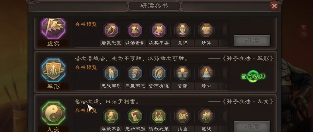 三国志战略版赛季里郭淮作为四星武将的核心价值在于其高性价比的辅助能力,尤其在盾兵阵容中表现突出。兵书选择需围绕其定位展开,纯辅助路线推荐九变系兵书,核心组合为诱敌之策+励军+救主,该配置能最大化团队增益效果,通过诱敌之策降低敌方输出效率,励军提升友军伤害,救主则强化主将生存。若阵容缺乏输出,可转为虚实系兵书,搭配攻其不备+神机,利用先攻状态弥补郭淮速度劣势,同时增强主动战法伤害。需注意兵书层级需随赛季进度逐步解锁,未开放第三层时优先选择前两层关键效果。