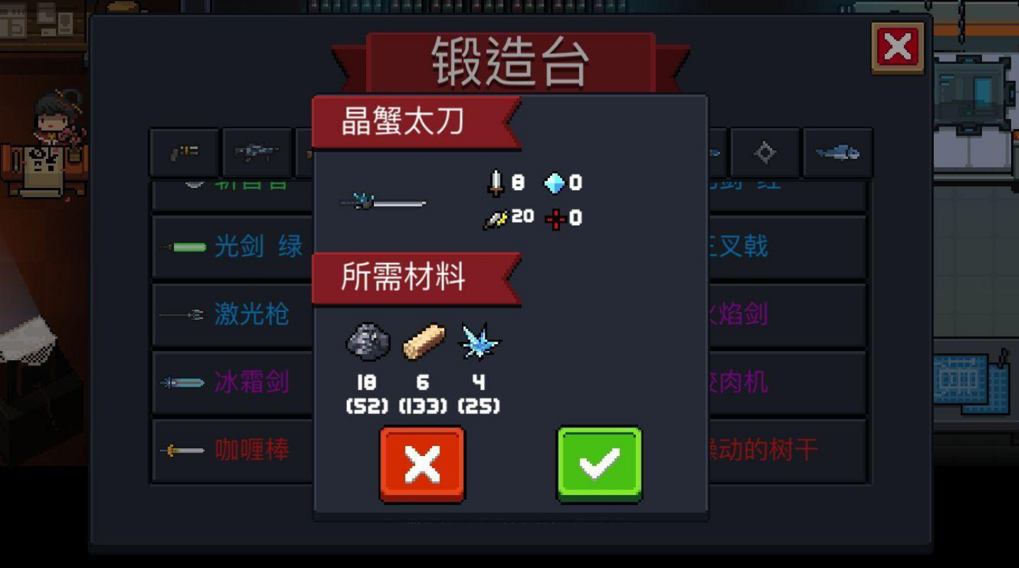 当满足获取次数和材料条件后,即可前往锻造台进行制作。锻造台位于游戏工作室区域,选择晶蟹太刀图标并确认材料充足后即可完成锻造。部分特殊武器如黄金土豪剑无法通过锻造获得,但晶蟹太刀属于可锻造红武范畴。