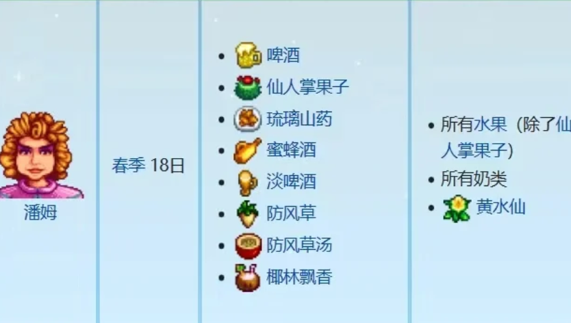 潘姆的喜欢礼物范围较广,涵盖黄水仙、咖啡、枫糖浆、所有奶类物品、除仙人掌果子外的水果,以及除虞美人外的所有花。需她不喜欢虞美人、石英、奇怪的小面包等物品,赠送这些反而会降低好感。每周最多可赠送两次礼物,生日当天额外赠送最爱礼物能获得8倍好感加成。
