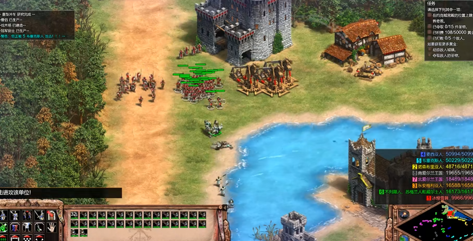 建议优先发展经济,确保木材、食物和黄金资源充足,以便快速训练攻城武器和骑兵单位。重型投石车是摧毁城墙和箭塔的关键,搭配铁甲步兵或骑士能有效应对敌方守军。同时需注意麦西亚人的海军骚扰,提前在海岸线部署战舰或箭塔防御。