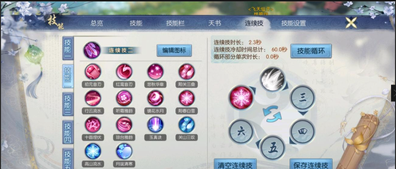 连续技的编辑需遵循冷却时间与效果叠加的逻辑。例如将琼花尽、听霜雅韵、凤求凰等控制技能编入第一组连续技,确保开场快速压制对手;第二组可配置行云流水、秋声等增益技能,用于团队续航;第三组则保留神爆、佛尊等爆发技能应对残局。注意避免将长冷却技能与短冷却技能混编,以免造成输出空档。