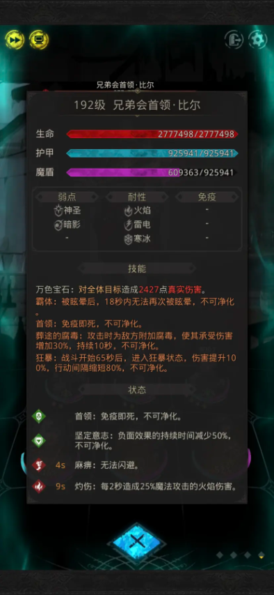 比尔的主要攻击方式包括火焰属性的单体攻击和神圣属性的群体攻击。单体火焰攻击会对仇恨值最高目标造成约1.2万点伤害并附加灼伤效果,若目标没有魔盾则每2秒受到795点持续伤害。群体神圣攻击造成约3200点伤害并可能附加降低40%伤害输出的恐惧状态。两种负面效果均可被净化技能清除,因此队伍中必须配置具有净化能力的治疗角色。战斗时注意保持主坦的魔盾值,及时使用战吼技能打断比尔的攻击节奏。