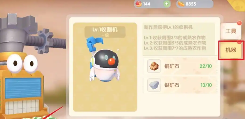 完成指定任务后即可直接获得摩摩收割机作为奖励。部分活动期间使用该设备收获农作物可获得双倍数量产出。制作摩摩收割机需要满足特定条件并收集必要材料。首先需解锁机器制造功能,通过店铺进入机器制作商店。在材料充足的情况下,选择收割机选项进行建造。制造过程消耗的资源包括金属、木材等基础材料,具体配方可能随游戏进程调整。建议提前储备各类制造素材以提高效率。