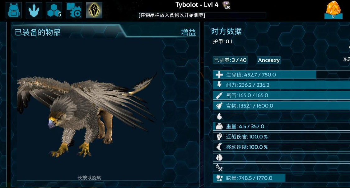 驯服狮鹫,首先得准备好它最爱吃的饲料。狮鹫最喜欢的食物是异特龙蛋饲料,其次是优质生肉、优质熟肉和普通生肉。异特龙蛋饲料的配方很简单:1个异特龙蛋、1个土豆、1个优质熟肉干、3个纤维、2个紫色浆果和1份水。如果觉得制作麻烦,也可以直接在琥珀商店买现成的。优质熟肉干需要用优质生肉烤制,而优质生肉可以从大型恐龙或者狮鹫尸体上获取。
