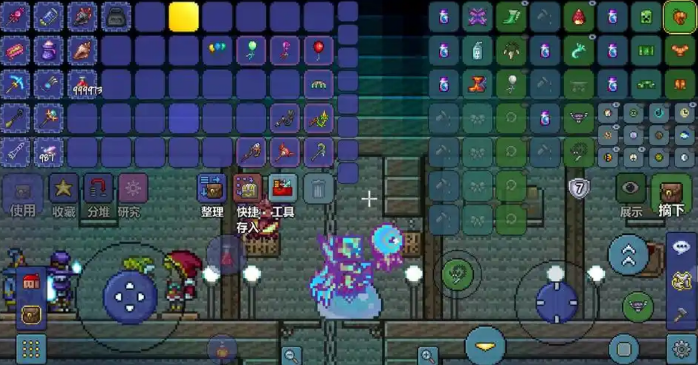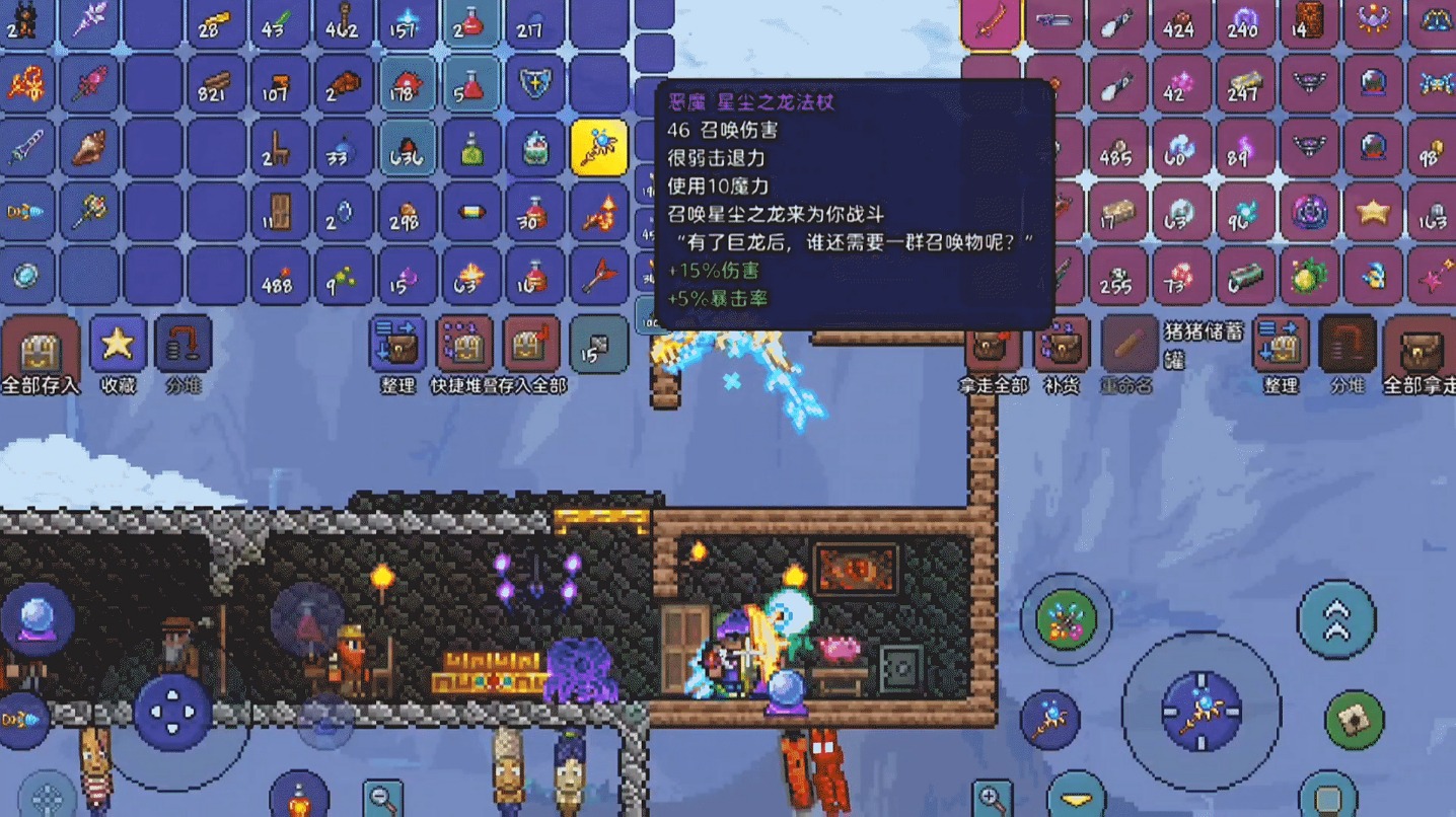 除了星尘套装,还可以搭配召唤师徽章、甲虫莎草纸、矮人项链等饰品,进一步增加召唤栏位。地牢中的施法者桌也是神器,站在旁边能临时多召唤一个仆从。如果追求极限,可以喝下召唤药水,再配合全息投影仪这类冷门配件,轻松突破20节限制。