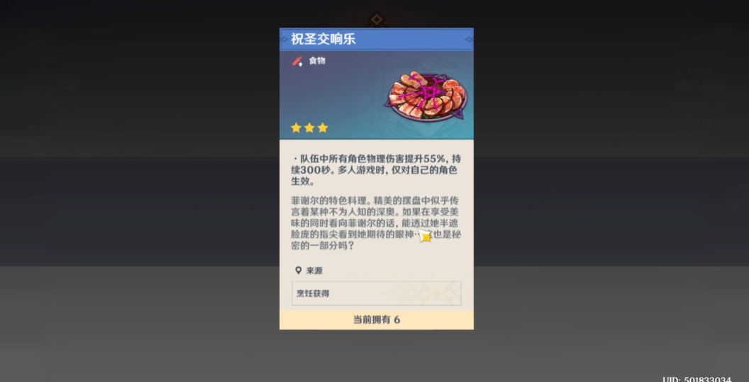 这款料理需要通过特定角色和食谱才能制作,是物理输出队伍的重要增益道具。祝圣交响乐是原神中一款隐藏的三星料理,其物理伤害加成效果显著,能够为队伍中所有角色提供55%的物理伤害提升,持续300秒。虽然制作材料普通,但获得过程需要完成特定挑战并使用特定角色,这增加了其获取难度和收藏价值。