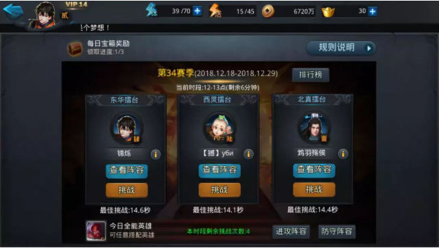 九天对垒是乱斗西游中一个非常有趣的挑战玩法,需要咱们挑选三名首战英雄和三名接力英雄组成队伍进行对战。这个玩法也被称为乱斗擂台赛,所有选定的角色都具有高战斗力,所以排兵布阵特别重要。如果咱们的战力等级不够,可以采取田忌赛马的策略,简单来说就是上打下,中打中,下打上,这样即使角色伤害不达标也能获取比赛胜利。活动奖励机制相当不错,而且不限制挑战次数,只要战力够高就能快速冲榜。