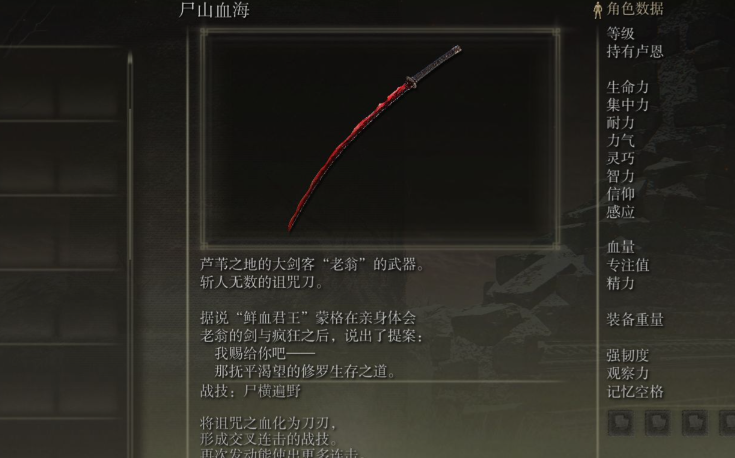 武器选择上,尸山血海和长牙是感应流的毕业装备,尤其是尸山血海,战技自带多段出血效果,配合切腹战灰能快速触发异常状态。如果还没拿到这些武器,前期可以用逆刺过渡,它的战技也能积累出血值。防具方面不用太纠结,选防御高的就行,只要负重别超限影响翻滚。护符推荐鲜血君王的欢愉,能大幅提升异常状态下的伤害,简直是感应流的灵魂配件。