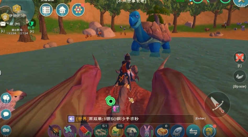 驯服后的大龟是超实用的战斗宠物,虽然不能当坐骑,但扛伤能力一流。它的背上有萌萌的水池和椰子树,战斗时还会甩出龟壳攻击,超有特色!如果中途不小心失手打死了,它会掉落鲤鱼和野味肉块,偶尔还能捡到龟壳材料,所以尽量稳着点操作哦。