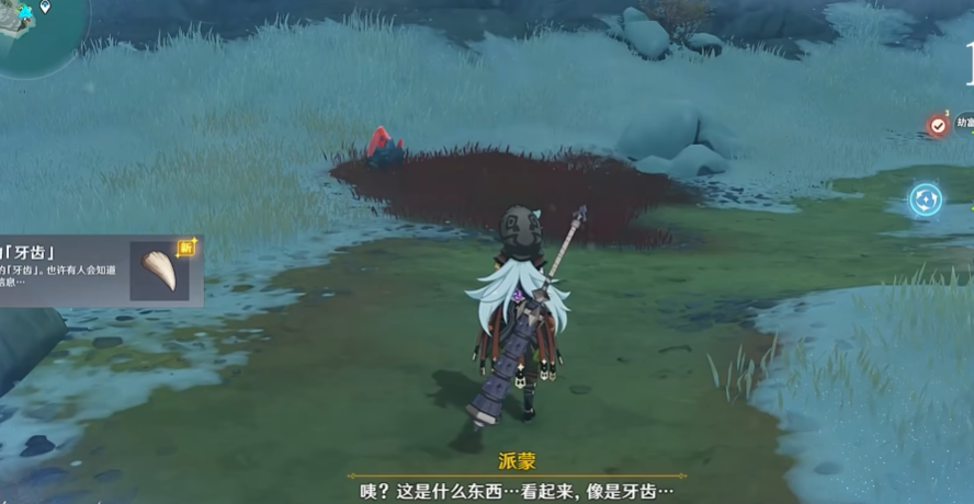 任务触发需在眠龙谷或雪山东南角拾取奇异的牙齿,四枚牙齿分布位置固定且可重复刷新。第一枚位于眠龙谷心脏状洞穴内,需击败守卫的愚人众;第二枚在河道小岛被古代坚冰覆盖,需利用对岸深赤之石破冰;第三枚需调查雪山东南角丘丘霜铠王守护的发光点;第四枚在愚人众营地附近调查获取。任意拾取一枚即可激活世界任务腐殖之牙,其余三枚作为后续任务目标需全部收集。