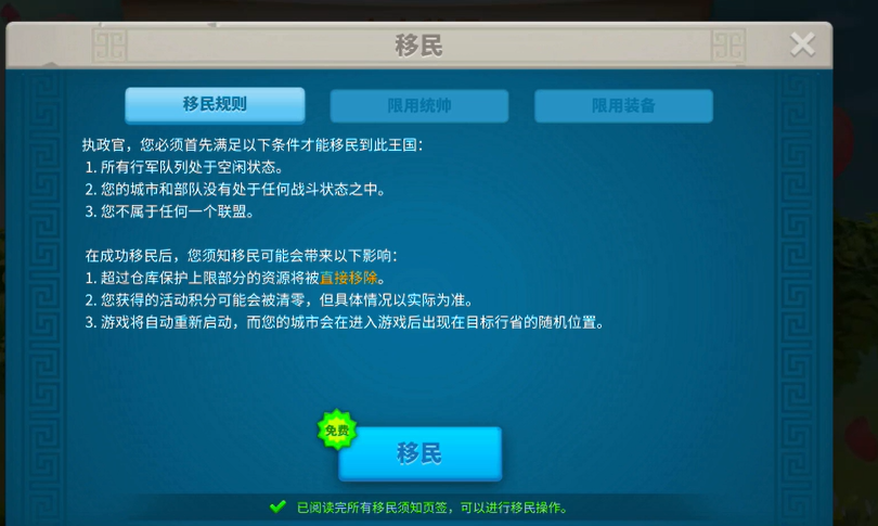 普通迁城需市政厅达到16级且持有足够移民令,数量与玩家战力挂钩。目标王国需开服超过90天,且玩家需退出当前联盟。迁移前建议清空行军队列,避免因战斗状态中断操作。资源需控制在仓库保护量内,否则超出的部分会在迁移后丢失。