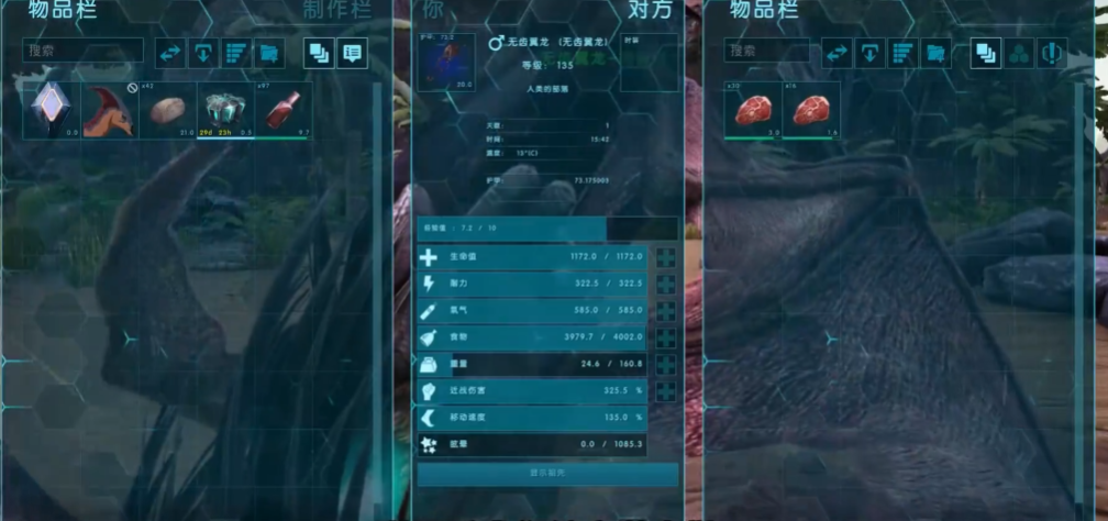 驯服后的风神翼龙可作为高效的运输工具及移动基地平台,其平台鞍需97级解锁。喂养时优先使用霸王龙蛋饲料,其次为生羊肉、优质生肉等,普通生肉效率较低不宜采用。需注意风神翼龙的眩晕值下降较快,驯服过程中需持续补充麻醉药或黑果子以维持其昏迷状态。其负重与耐力属性决定了长途飞行的实用性,建议优先提升相关属性以优化使用体验。