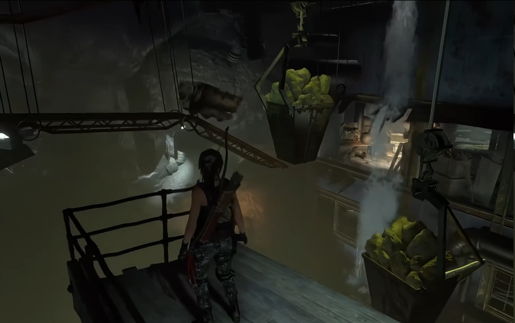 古墓入口位于铜矿工厂上层,走到坑道末端滑索道下去就能到达下层被水淹没的矿坑。记得遇到岔路要走右边,路上可以收集瓶子和布料制作燃烧瓶,用来烧开前面的障碍物。继续前进时会遇到一辆滑下来的矿车,这时候只能顺着坡道滑下去。探索下层坑道来到一个房间,桌子上有遗物,但前面有障碍需要解决。