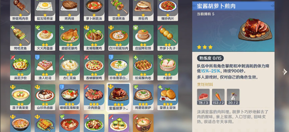 该料理的效果为降低队伍角色攀爬、冲刺及滑翔时的体力消耗20%,持续300秒,对于探索大世界地形具有实用价值。完美烹饪可提升效果至25%或更高,但需掌握火候时机。配方解锁后,玩家可在任意烹饪点制作,建议提前储备材料以应对长途探索需求。