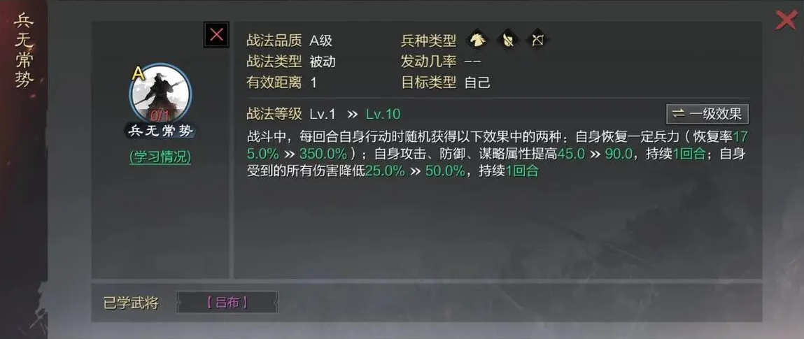 兵无常势是游戏中非常实用的A级被动战法,能在战斗中每回合随机触发三种强力效果之一:恢复兵力、提升攻防谋略属性或降低受到伤害。这个战法特别适合需要稳定续航或属性加成的武将,比如郝昭这类依赖持续作战的前排武将。想要获得它,主要通过拆解特定武将或战法研究来实现。