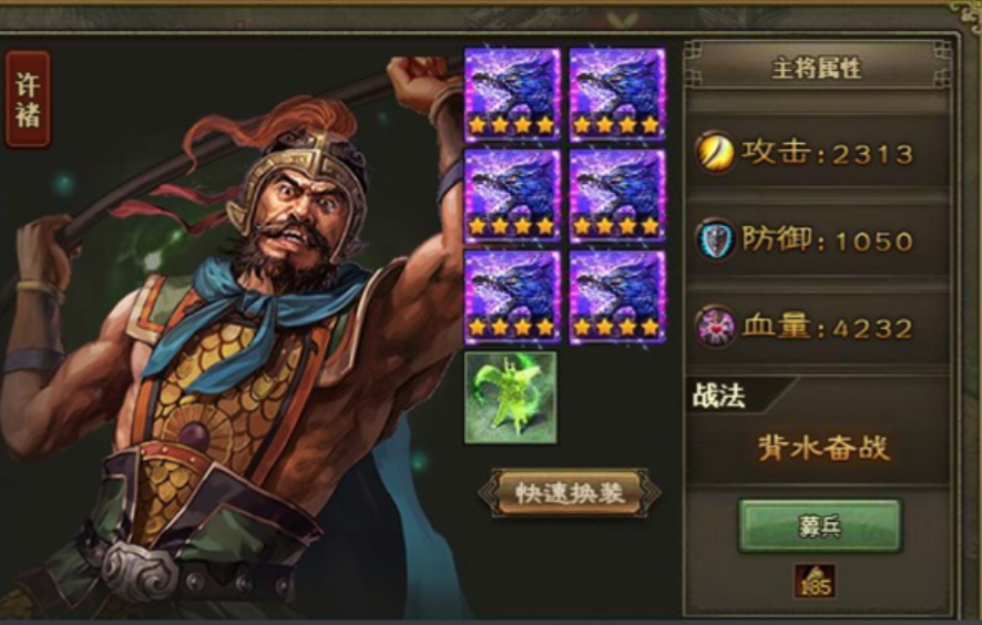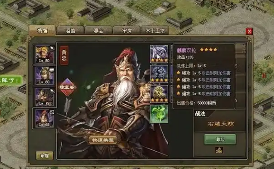 推荐使用黄忠作为主将,等级需达到78或79级并配备一套四星紫色强防装备。黄忠作为地形将,能有效减少敌方伤害,确保前排稳定抗压。甘宁需达到81级装备至少两件四星强壮装,以提高抵挡郭嘉战法的概率。马超和许褚作为补充输出,需合理分配防御和血量装备,确保在后期收割阶段发挥作用。