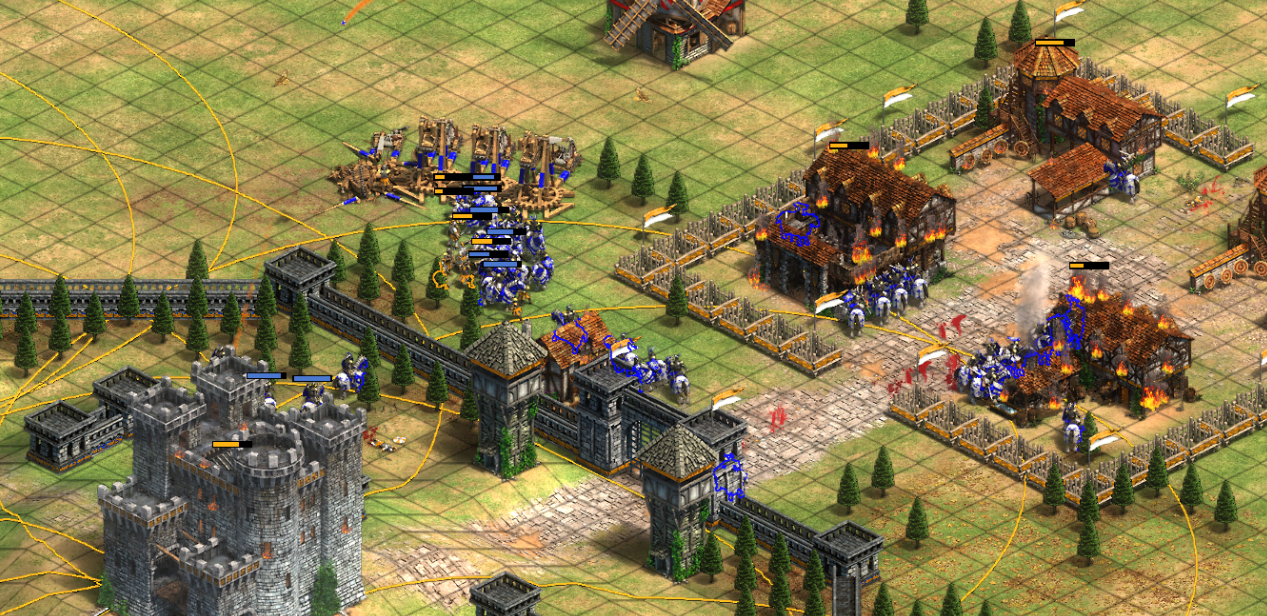 直城打法核心在于快速升到城堡时代,抢占军事优势。开局需要合理分配村民,6人吃羊,4人伐木,10人引第一只猪回家。如果发现猪被偷或找不到,可以赶3-4只鹿补充食物,同时增加采果人数到6-8人,并提前种田。黑暗时代最后2个村民去采金,升级织布机的话需要3人采金,否则2人足够。到封建时代后继续出2个村民,同时拉伐木村民建造市场铁匠铺,点下城堡时代升级。一级伐木必须升级,一级田视战术需求决定。