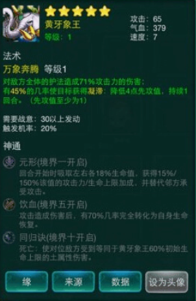 缘系统设计进一步强化了其输出特性,与青毛狮王、黄牙象王组成狮驼三王组合可获得15%血量加成,装备业火三灾武器提升15%血量,磐龙凤翔带防具增加15%攻击。法术搭配推荐选择阴阳二气诀获得10%攻击增益,这些缘分加成能在一定程度上平衡其攻防属性。队长技能高级魔族解放可为全队魔族单位提供大量伤害提升,在纯魔族阵容中具有战略价值。