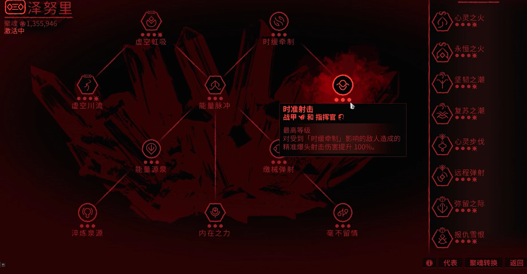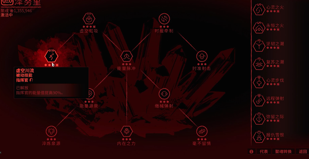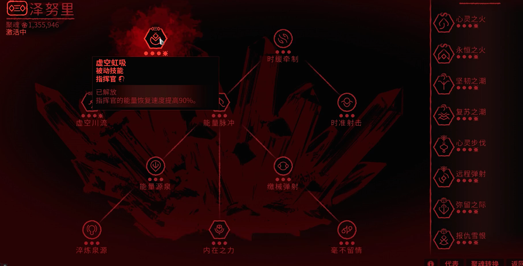 推荐优先解锁能量脉冲和能量源泉技能,前者提供基础能量恢复支持,后者制造持续回蓝区域,是核心续航手段。萃炼泉源可扩大回蓝区域范围并延长持续时间,适合高强度战斗场景。内在之力被动技能可减少技能消耗,间接提升能量利用率。若专精点数充足,可解锁虚空川流以提升指挥官能量上限,增强持续作战能力。