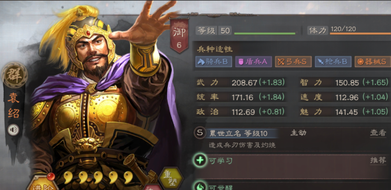 袁绍在游戏中最适合的兵种是弓兵和盾兵,这两个兵种的适配性最高。弓兵能充分发挥他的远程输出能力,盾兵则能提升生存能力,让他在前排更持久。他的战法累世立名可以降低敌方统率并附加灼烧效果,作为主将时还能提升全队防御,因此兵种选择要围绕他的战术定位来搭配。