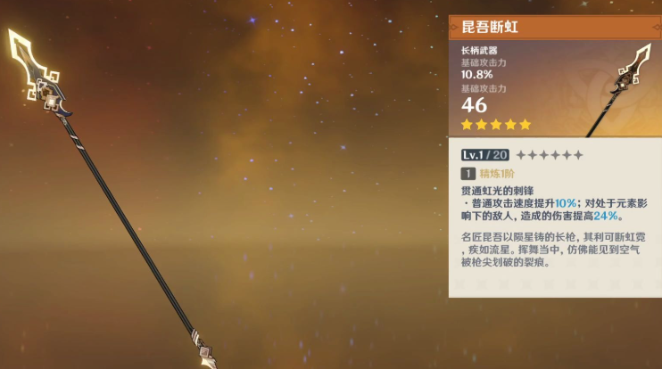 昆吾断虹是五星长柄武器,仅能通过祈愿系统抽取获得。这把武器的获取完全依赖概率,没有其他固定途径或活动奖励。其基础属性提供攻击力加成,并附带提升普通攻击速度与对元素影响下敌人的伤害加成特效。由于属于限定五星武器,通常仅在特定武器祈愿池中UP时抽取概率较高,玩家需提前规划原石储备。