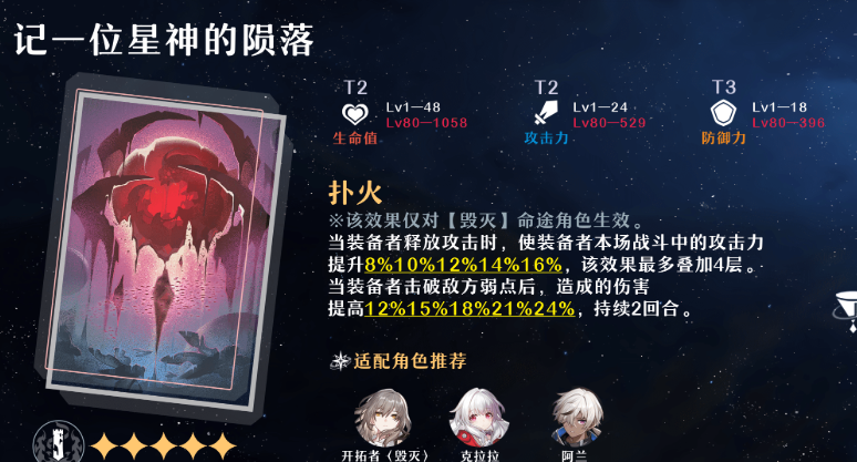 记一位星神的陨落作为毁灭命途光锥,其核心机制是通过攻击叠加攻击力加成,满叠影后最多可获得64%攻击力提升。该光锥适用于克拉拉、物理主角、虎克、阿兰等毁灭角色,尤其在没有克拉拉专武时是不错的替代选择。虽然其附加的弱点击破增伤效果触发条件较为苛刻,但基础攻击加成的泛用性使其成为黑塔商店中最值得优先兑换的光锥之一。