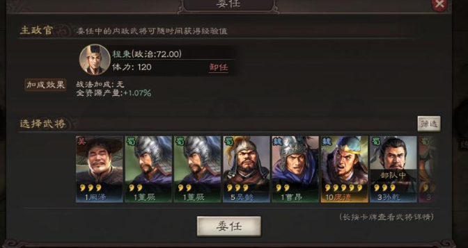 委任之前记得先看看武将的属性和战法,不同职位需要的属性不一样。比如木材官、采石官这些资源职位,优先选政治高的武将,而寻访使、驯马官这类职位更适合魅力高的武将。前期不用太纠结五星将,因为低等级时成长再高也比不过满红三星四星的属性加成,等后期五星将等级上去了再替换更划算。