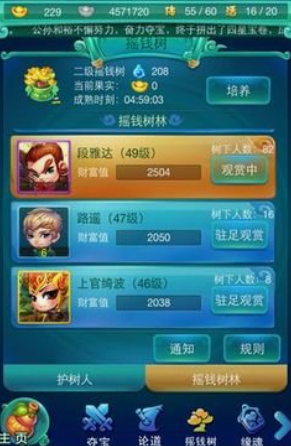 成熟后的摇钱树会出现在摇钱树林中,其他玩家可以驻足观赏。系统会随机选中5名玩家赠送元宝,所以没事多去逛逛别人的摇钱树,说不定就能捡到额外福利。需成熟时如果树上还有未清除的妖虱,会按数量扣除部分元宝,所以及时除妖很重要。同一时间只能存在一棵摇钱树,收获后才能继续种植下一棵。