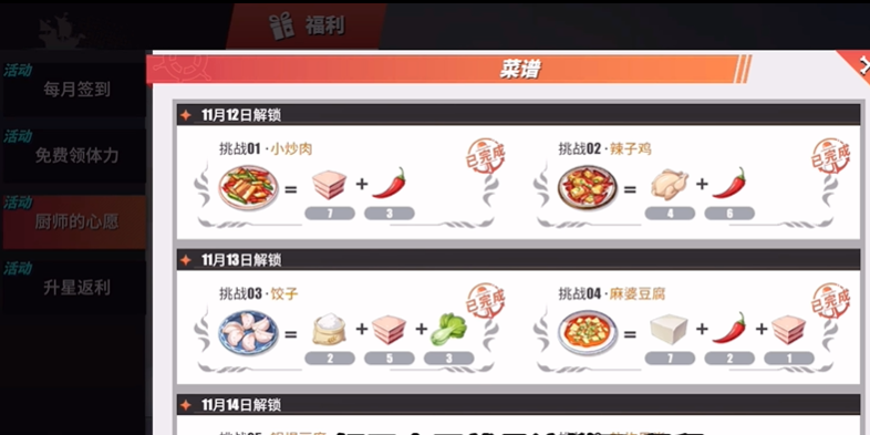食材是制作料理的基础,不同食材的获取途径各有讲究。扫荡觉醒石副本能拿到猪肉、辣椒和面粉;经验书副本产出鸡肉、鸡蛋和豆腐;进化卡副本掉落胡萝卜和花生;鲸鱼卡副本则提供白菜、木耳和黄瓜。如果是限时活动比如厨师的心愿,部分特殊食材需要通过寻宝之旅玩法收集,比如功夫争霸赛掉茄子、辣椒,深海突围战给鸡肉、蘑菇,乱斗马戏团出虾仁、胡萝卜等。记得每天免费刷新三次任务,合理分配体力刷对应副本哦。