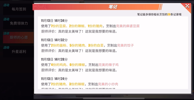 料理不仅能临时提升战力,还能用来增加伙伴好感度。比如布丁、奶油烤玉米和串烤蘑菇这类基础料理,赠送后能加50点好感度,如果送给对应属性伙伴效果还能翻倍。平时多积累食材,遇到厨房升级或活动时就能快速制作高级料理。如果暂时缺资源,优先做能提升主力伙伴好感度的食物,其他角色可以先喂到16级拿金果奖励。厨房经验靠制作料理慢慢积累,所以有空就挂上几个低级料理练练手,别让山治闲着呀。