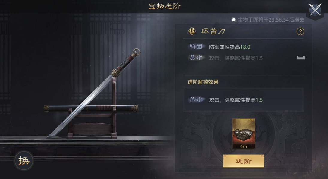 宝物强化是提升属性的核心步骤,使用材料可提高成功率,不同类型宝物需不同材料。精品宝物最高强化至5级,罕俦宝物可强化至10级,稀世宝物则固定为10级。强化时可选择提升特定效果,失败会累积成功率加成。进阶需通过工匠完成,精品5级后可进阶为罕俦,罕俦5级后可进阶为稀世,每次进阶会改变宝物名称和形态,并消耗特定材料。罕俦宝物需武将20级,稀世需30级,若武将等级不足,宝物效果会暂时失效。