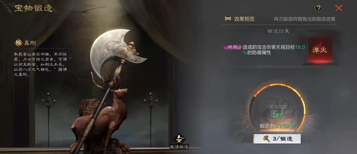 宝物的编辑与培养是提升武将战力的关键环节。玩家需要通过陈情界面的工匠事件获取宝物,工匠每天8点随机刷新,持续24小时,若未操作则会消失。打造宝物需消耗铜钱并等待24小时,也可花费100虎符立即完成,但性价比不高。打造时有概率获得次品或精品,精品才能进行后续强化和进阶,次品仅能拆解或使用,赛季结束会被清零。