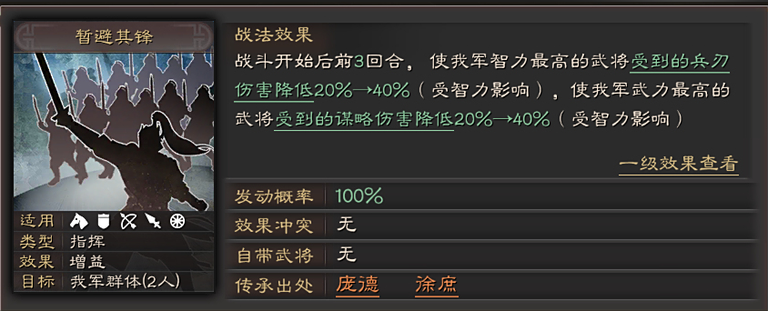 除了上述那种围绕主动战法发动的思路,法正也可以走更纯粹的辅助路线。比如携带暂避其锋、抚辑军民这类高额的指挥减伤战法,为全队尤其是核心输出武将提供稳定的前期保护。或者携带八门金锁阵这种先手减伤战法,为己方创造先攻优势。这种搭配下,法正更像一个提供光环的工具人,他的自带战法则作为额外的惊喜和补充。需法正的兵种适应性是盾兵S,枪兵和弓兵A,所以他最常见的出场方式是组成各种蜀盾或三势盾阵容,利用盾兵的高防御打持久战,把他的治疗和减伤效果最大化。