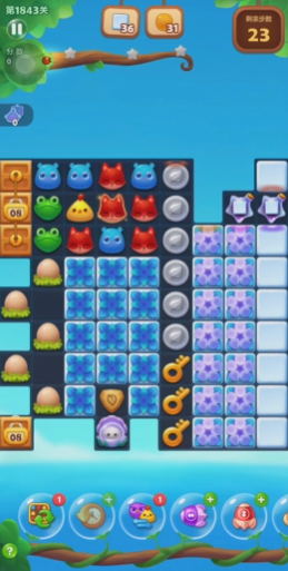 这关的进程中有几个关键点需要特别注意处理。首先是要尽快点亮屏幕上的双精力瓶,也就是星星瓶,它们亮起来之后要马上交换,这样可以来一次全屏消除,能清掉不少障碍物,比如毒液,并且让钥匙出现。钥匙出现后要抓紧时间消除掉它们,打开左侧被锁住的区域。打开区域后,注意力就要集中到右侧的魔法石上了,持续攻击它,让它不断激活,这样能带动旁边的鸡窝持续爆出小黄鸡。尽量让棋盘右侧不要空着,保持有动物可以连消,这样魔法石被激发的频率会更高。单纯去敲打鸡蛋,效果可能不如依靠魔法石带动鸡窝来得快和多。