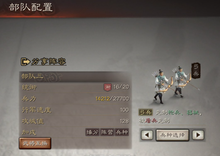 选择部队是游戏里非常重要的一个环节,它会直接影响你在战场上的表现。部队的组成包括武将和兵种的选择,你需要考虑武将的统御值和兵种适应性,统御值决定了你能上阵哪些武将,而兵种适应性则影响部队的战斗力发挥。游戏中兵种分为骑兵、盾兵、弓兵、枪兵和器械兵,每个都有自己独特的优势和弱点,比如骑兵移动快适合突袭,盾兵防御高能承受更多伤害。