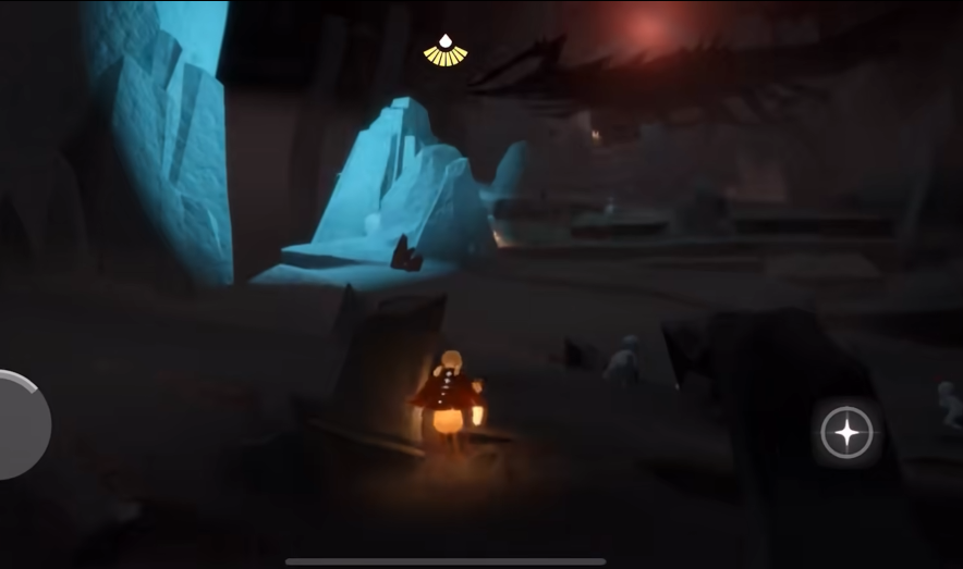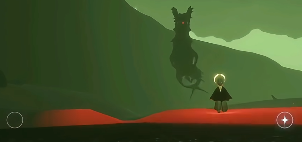 接下来就要面对墓土最出名的敌人冥龙,大家都爱叫它皮皮虾。从第二张图开始,它们就出现了。一开始是一龙图,这里只有一只冥龙在巡逻。看到它们千万别太紧张,因为这些大龙虾的巡逻路线基本都是固定的。你要注意观察,当它的探照灯是蓝色的时候,说明它还在搜寻,一旦变成红色,那就表示它已经锁定你了,红光就是警告!这时候你必须立刻、马上找到最近的掩体躲起来,比如附近的石墙、断桥下面、大石头或者管道里面,躲进去等到身上的红光消失再出来。如果不幸被红光锁定又没地方躲,你可以试试快速切换手机后台或者拉下通知栏,这招有时能救命。实在不行,在被撞到前快速打开设置回遇境,也能避免损失光翼。被冥龙撞到会直接掉光之翼,可能让你降级,所以一定要足够警惕。除了冥龙,地上还有黑色的小石头螃蟹,它们会撞你,不过你可以长按自己的人物大叫,发出的声波能把它们掀翻,这样就能安全通过了。