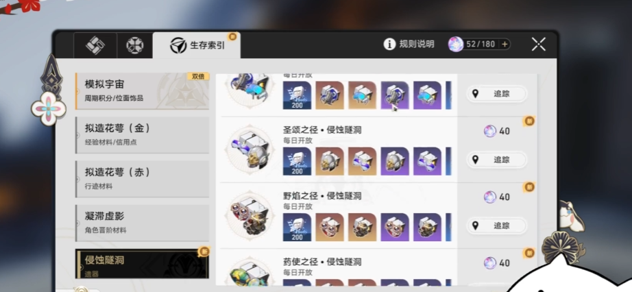 金色遗器的获取条件更严格一些,均衡等级到达三级也就是开拓等级50级后,刷侵蚀隧洞就必定掉落五星遗器。模拟宇宙的第五和第六世界在难度一就能直接刷出金色遗器,而第三和第四宇宙则需要均衡等级三解锁难度二才会必出。大月卡如果升到40级,还能拿到自塑尘脂,可以直接定制主属性的金色遗器,省去不少刷的麻烦。除了常规副本,还有别的方法能拿到遗器,比如在大世界里开宝箱,经常会捡到四星遗器,用来前期过渡挺合适的。任务奖励、活动参与和商店兑换也能获得一些遗器,虽然品质可能不高,但积累多了也能用上。前期别太纠结金色遗器,先把角色等级、行迹和光锥培养好更划算。记住遗器分头部、手部、躯干、脚部、连接绳和位面球,每个部位主词条不同,刷的时候多留意一下。