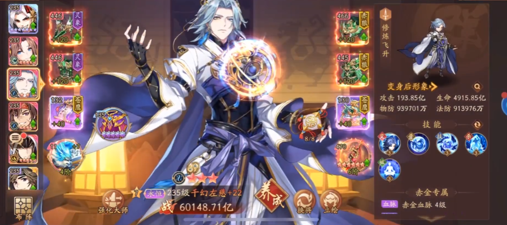 选择装备不能光看表面,得和他的技能机制深度绑定才能真正发挥作用。左慈的技能设计很有层次,比如他的怒气技能仙华之阵和必杀技玄凛地狱,都对身上带有减益状态的敌人造成双倍伤害,这就意味着任何能帮助他更稳定地给敌人挂上负面状态的装备属性,比如效果命中,都极具价值。他的被动技能证道更是核心,能在战斗中通过完成飞升任务来升级法器,并获得强化全体攻击范围、增加额外伤害等强力效果,因此装备如果具备成长性或能叠加增益的特性,会与他非常契合。他的变身技能无方变是关键的翻盘点,能造成大量伤害并有高概率施加强控,装备的选择要确保他在变身阶段能安全打出这套爆发。理解了他的技能链条,你就会明白为什么推荐朱雀羽扇增强续航来支撑他完成证道任务,为什么八卦牌强化控制能帮他触发双倍伤害,这些装备都是围绕他的技能特性做文章,目的是让他的每个技能效果都得到最大化释放。