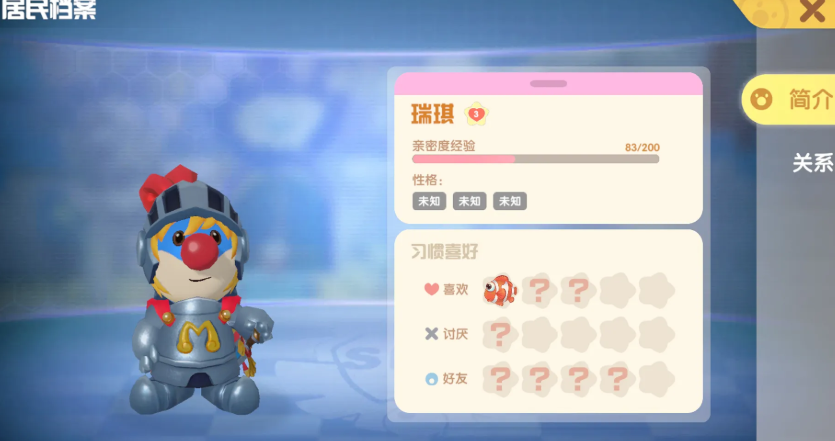 了解瑞奇的个人偏好是提升亲密度的关键,他作为骑士团团长,特别喜欢某些物品。瑞奇偏爱的礼物包括小丑鱼,可以在阳光牧场的神秘湖中钓到;抱抱熊,需要在拉雅雪山的晴天时间段内获取;以及毛毛爆囧菇,这需要玩家厨师等级达到16级后才能制作。一定要避免赠送他讨厌的怪怪鱼,否则会适得其反。