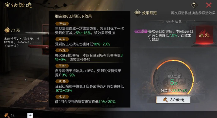 重铸的具体操作是在宝物强化满级后,消耗两个对应的进阶材料开启锻造,首次锻造会随机生成词条效果。如果对结果不满意,玩家可以花费虎符进行重新锻造,费用依次为800、1200、1600、2000、2400、2800,总计12200虎符。每次重铸都有概率改变词条的等级和属性,例如筹算词条可能从5到15分为多个级别,玩家需要多次尝试才能获得理想效果。重铸过程中,宝物无法再进行进阶操作,因此需谨慎选择时机。