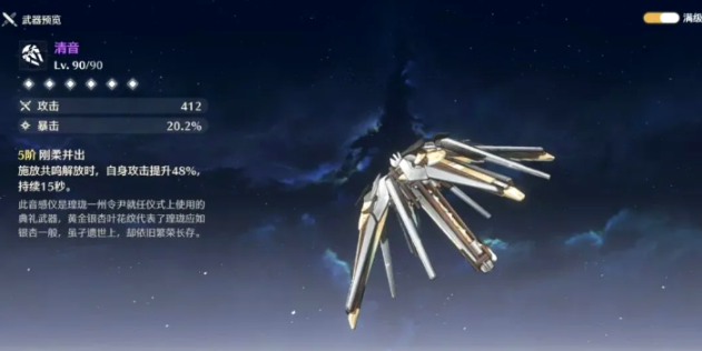 清音的核心价值在于同时提供暴击率和攻击力这两种珍贵的输出属性。一把90级的清音能为角色提供412点基础攻击力和20.2%的暴击率,武器技能刚柔并出进一步在施放大招后强化自身攻击。这意味着,任何一位使用音感仪、且主要伤害来源于大招或追求短期爆发的角色,都可以从这把武器中获益,它能有效降低角色对圣遗物等装备中暴击率词条的需求,让玩家更容易配装达到合格的暴击面板,从而稳定打出暴击伤害。
