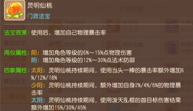 成功获得专属法宝灵明仙桃后,你便开启了培养之路。这件法宝的基础效果是提升角色自身的物理暴击率,具体数值随法宝等级增加,效果持续6回合。法宝的升级会消耗人物经验,如果想加快进程,可以直接使用仙气进行升级,这种方式不会占用每周有限的法宝修炼次数。激活法宝的四象属性还需要消耗一笔不菲的银币。在四象属性的选择上,通常推荐太阳或少阳属性,其中太阳属性能在你使用当头一棒技能时额外提升暴击率,追求极致的爆发伤害,而少阳属性则是稳定增加物理暴击概率,适合追求稳健输出的玩法。