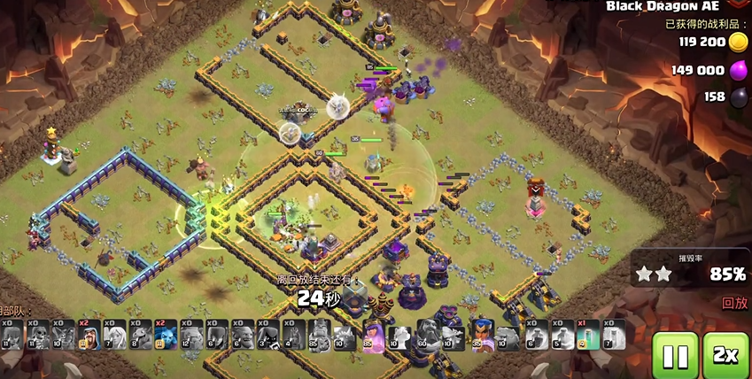 野蛮人之王和弓箭女皇作为高血量的英雄单位,主要作用是吸引黑龙的仇恨并引导其进入预设的杀伤区域,将双王特别是弓箭女皇布置在防空火箭附近,可以配合周围的箭塔和法师塔形成交叉火力,他们的存在能为防御建筑争取到稳定的输出环境,因此他们的等级和位置需要慎重考虑和投入。