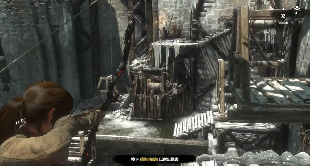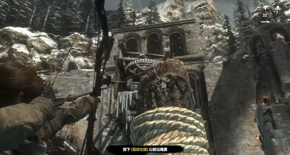 使用绳箭连接近处和远处的两个转轮。连接完成后,你需要返回一层场地中间的原始转轮处。再次转动转轮,这次的目标是让左边的平台高于右边,调整好后同样去木桩处固定位置。攀爬到标记的平台上,跳到前方的线索上并向右攀爬回到第二层右边的平台。最后的步骤需要速度和精准,在第二层右边平台操作转轮,使对面第三个平台上升到最高处,一旦它升到顶,你必须立刻离开转轮,快速跳到对面的平台上,并最终从该平台跳到墙壁上,利用二段跳抓住边沿,从而成功到达第三层平台。