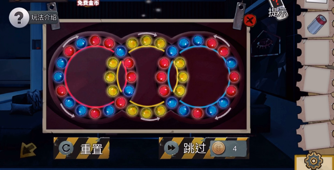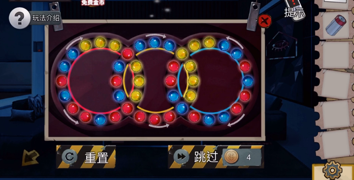 转盘谜题的关键在于先观察转盘的结构和颜色分布,通常需要将特定颜色的珠子或图案转到对应位置。中间大转盘会影响两侧小转盘的位置,而小转盘之间也会互相联动,所以操作顺序很重要。一般先从左边小转盘开始调整,然后操作中间大转盘带动整体转动,接着处理右侧小转盘,最后再微调中间转盘完成对齐。记住每次转动后都要停下来看看整体变化,避免盲目操作打乱已有的正确位置。转珠子的核心逻辑是让内环颜色与外环标记匹配,比如左边红色要对准红色区域,中间黄色和右边蓝色同理。