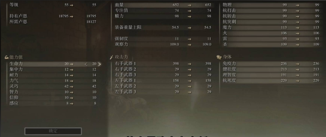 中期发展阶段需要兼顾耐力的提升,该属性直接影响装备负重和精力值。建议将耐力维持在14-15点区间,这是携带重型武器且保持中等翻滚速度的平衡点。若负重超过阈值会导致行动迟缓,严重影响战斗节奏。同时根据所选武器的需求补足敏捷属性,通常13-15点即可满足大部分力敏流武器的使用条件。这种阶段性的加点方式能确保角色在攻防两端稳步成长。