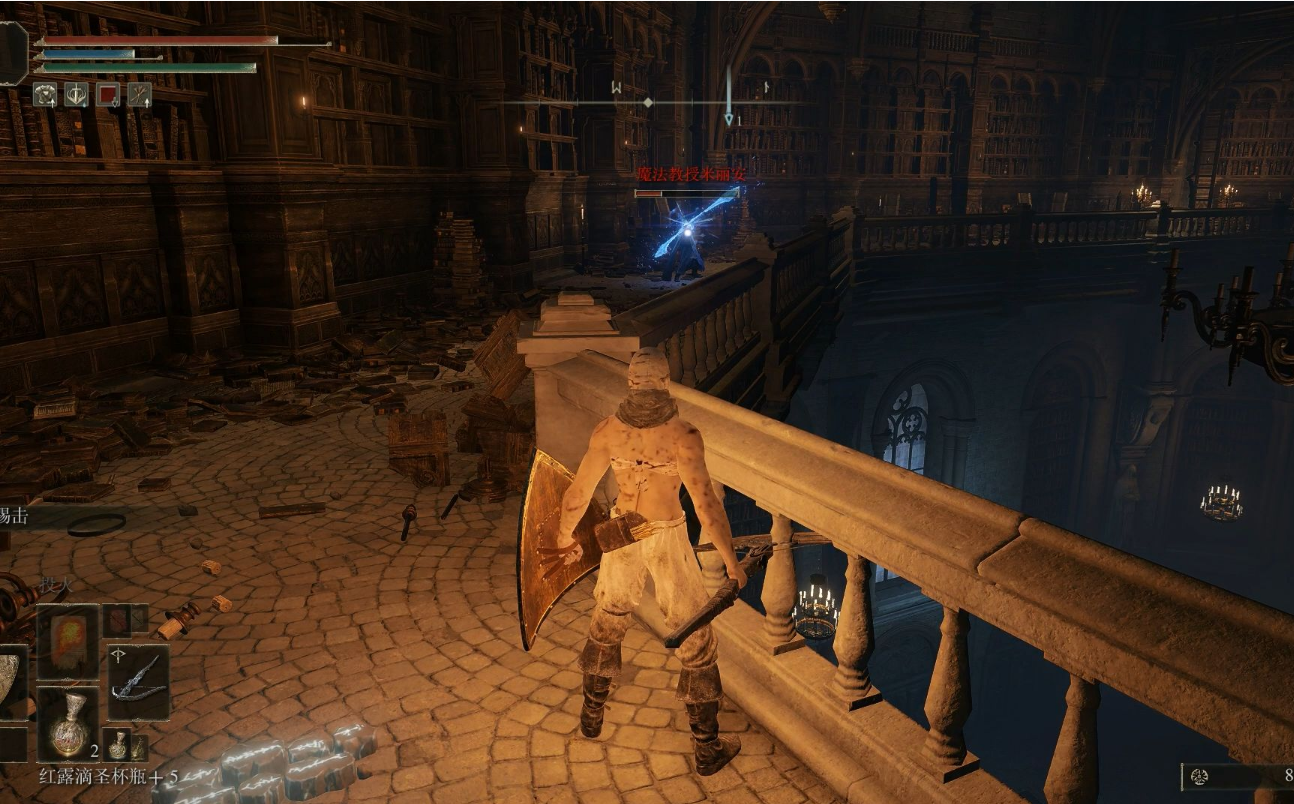 空间颠倒后,书斋内部结构会发生显著变化。原本无法通行的区域会出现新的平台与通道,需从台座旁跳至下层悬浮石板,沿边缘移动至特定窗口。注意部分平台存在断裂或隐藏路径,需仔细观察环境细节。主要行进方向为向下层探索,途中需利用倒置后的吊灯作为跳板,逐步下降至底部电梯处。该区域敌人以魔法教授米丽安为主,其会使用瞬移与远程魔法攻击,建议优先清理周边小怪再集中应对。