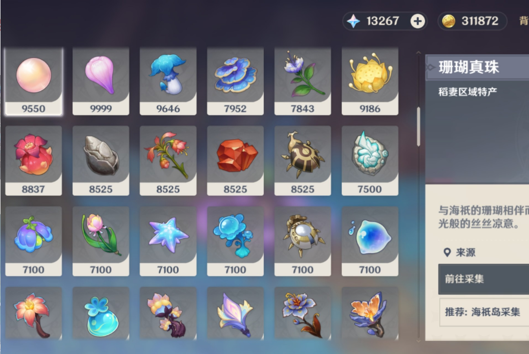 快速收集珊瑚珍珠,咱们得先知道这玩意儿主要分布在海祇岛的珊瑚宫周边,包括水月池、望泷村和渊下宫这些地方。珊瑚珍珠是心海和五郎的突破材料,每次采集后需要等48小时才会刷新,所以建议一次性多采点备用。最省时间的办法是跟着固定路线跑图,比如从珊瑚宫上方的传送点开始,沿着瀑布和浅滩一路往下搜刮,能捡到不少。如果懒得跑图,也可以去稻妻离岛找商人山城健太或者须弥奥摩斯港的巴巴克直接购买,不过每人限购5颗,价格也不便宜。