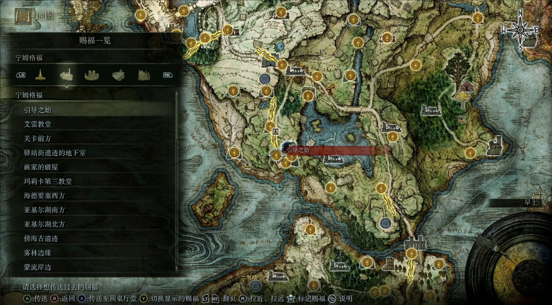 离开初始场景后,咱们会来到宁姆格福区域。这里地形开阔,敌人强度较低,适合熟悉操作和机制。优先激活赐福点,它们不仅是复活点,还能分配血瓶和蓝瓶的使用次数。艾蕾教堂是第一个关键地点,晚上来这里会遇到魔女蕾娜,拿到招魂铃和灵马哨笛,从此探索效率大幅提升。